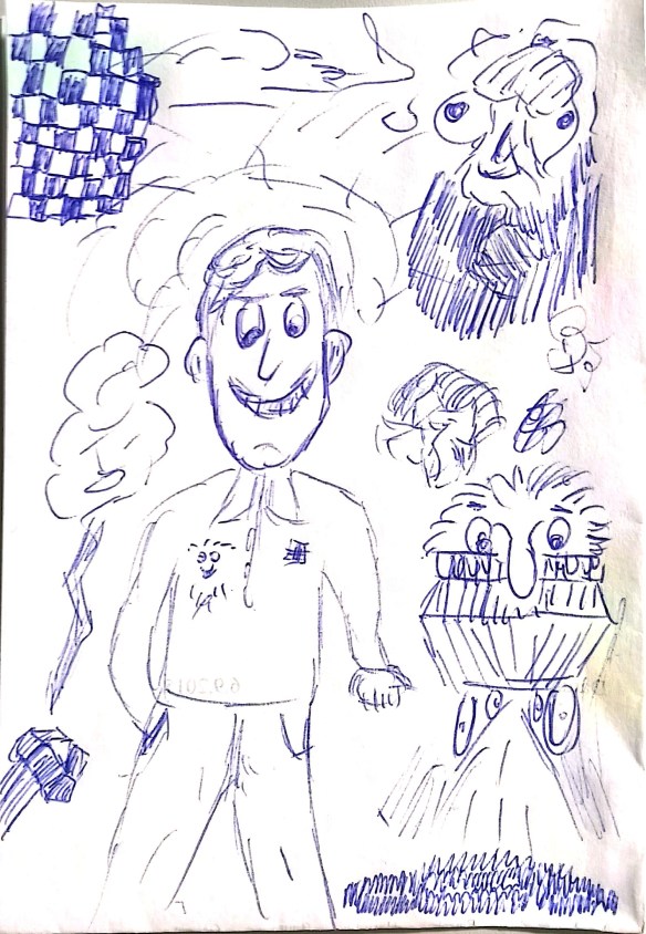 Das harmloseste Doodel-Bild habe ich hier angehangen und zuvor noch digital nachbearbeitet, auch wenn es gut erhalten ist. Das Bild ist eigentlich recht unpersönlich in seinem Inhalt. Wirr und spielerisch. Wie ein Brainstorm.
