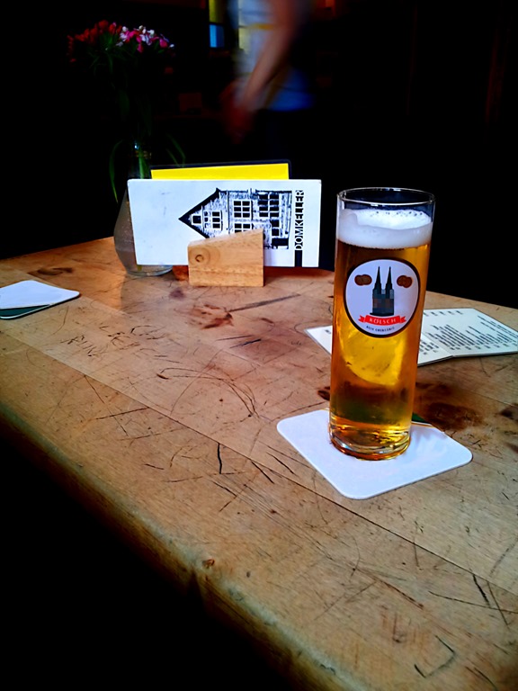 “Kölsch-Kneipe mit nur Bayern-Kanaken. Himmelsrichtung egal. Kommen von überall her hier rein. Wollen alle nur Kölsch. 32 Grad hier drinnen, außen eh mehr. Dafür ist kein Himmel zu sehen. Wahrscheinlich eh milchig außerhalb. Innen drinnen handgeschnitzter Kneipentisch. Kein Wasser. Jon mr fott domet. Dafür frisches Kölsch. Prickelt und zischt, das es eine Freude ist.”