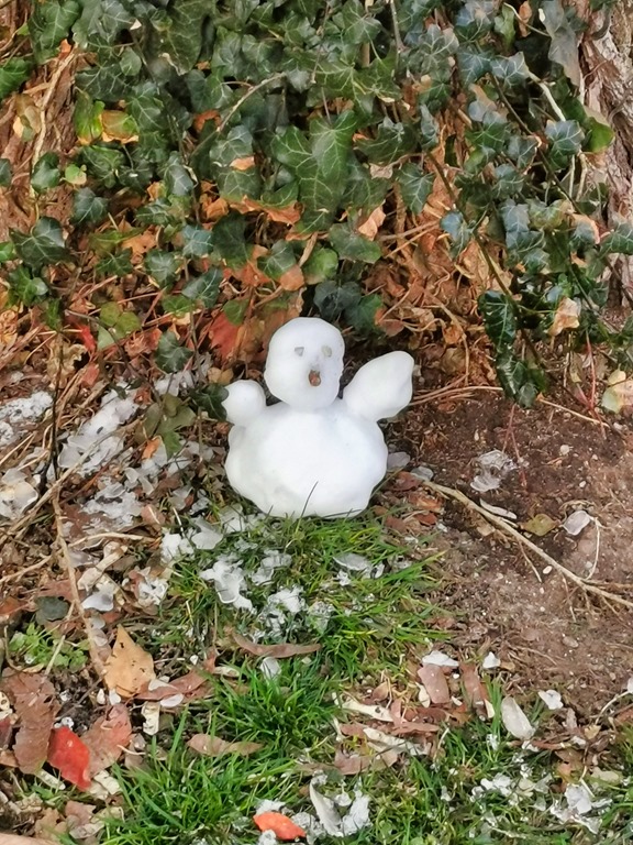 In der Nacht ist wohl ein wenig Schnee gefallen. Etwas, nicht viel, kaum des Boden bedeckenswertes. Fast gar nichts. Zumindest war es ungewöhnlich kalt. Irgendetwas unter Null Grad sicherlich. SchneemannAuf dem Weg zur Arbeit sah ich einen kleinen Schneemann unter einem Baum sitzen. Er wirkte überrascht und schien zu winken. Ich näherte mich ihm auf weniger als ein Meter fünfzig und machte mein Foto. Keine Ahnung, ob ihn noch jemand beachtet haben wird. Die erste Morgensonne wird ihn wohl kompromisslos weg geschmolzen haben.