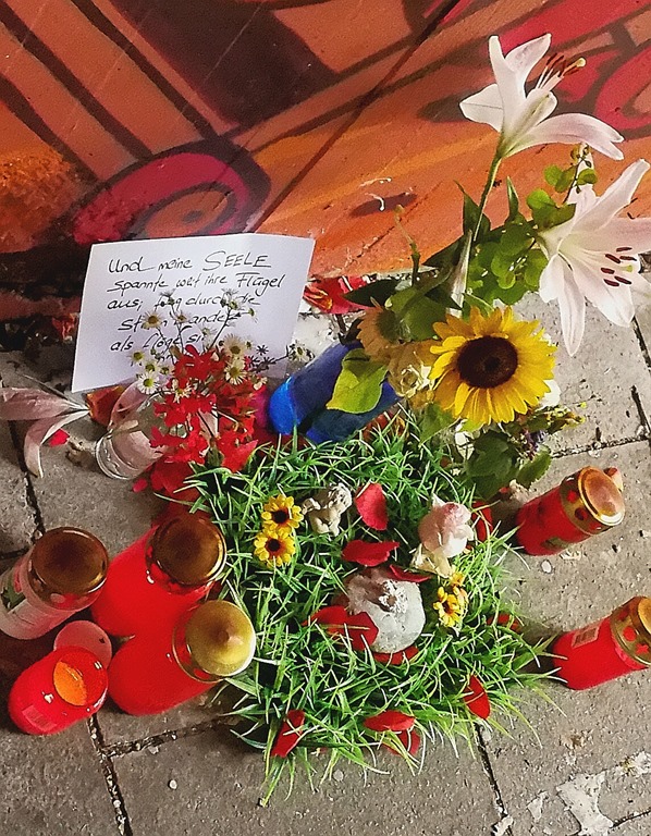 IMG_20170907_142556Seit der letzten Winterzeit hat sich in eine S-Bahnunterführung unweit meiner Wohnung ein Obdachloser eingerichtet gehabt. Es war dort nicht wärmer als draußen, aber vor Schnee und Regen geschützt nächtigte er in der Unterführung auf dem Gehweg. Mit der Zeit hatte er verschiedene Decken und Matratzen dort angehäuft, unter denen er sich verbarg wie ein Eskimo im Iglo. Im Frühjahr darauf wurden seine Habseligkeiten regelmäßig von der Stadtreinigung weggeräumt. Die Unterführung hatte es ihm jedoch angetan. Selbst im Sommer kehrte er wiederholt dorthin zurück, um zu übernachten, bis er wohl des Platzes verwiesen wurde. Seine Sachen waren verschwunden. Zurück ließ er lediglich eine Stätte mit Blumen, Grabkerzen und ein auf einem Zettel nieder geschriebenen poetischen Gedanken. Der Ort dafür war eindeutig strategisch gewählt und befand sich bei einer Stelle, an der viele Leute vorüber mussten. Viele von ihnen blieben stehen, schauten sich das Arrangement an und grübelten, um was es sich wohl handeln könnte. Wer wohl dort gestorben sein könnte und ob es sich um jenen Obdachlosen des Winters handeln könnte, war deutlich auf deren Stirn ablesbar. Ich vermute, der Obdachlose, der die Stätte täglich mit frischen Blumen und Grabkerzen vom nahe gelegenen Friedhof betreute, freute sich darüber wie ein Schnitzel.